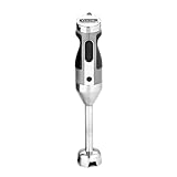 Meet your new sous chef. The Viking professional hand blender makes quick work of everything from soups to smoothies to coffee beans with a professional-grade 300-watt motor. And thanks to ergonomic design and heavy-duty stainless steel standard attachments, it looks good doing it too. With this powerful hand blender from Viking, you get a professional grade 300 watt motor that provides powerful stability and smooth processing. Heavy duty Viking design incorporates ergonomic non slip grip handle. Rubberized non slip grip allows you to grasp the unit without it slipping during processing. Two speed pulse control offers flexible performance and automatic safety shut off. The units shuts off when touch is lost from the power buttons (high and low speed). Standard accessories include stainless steel blending attachment, stainless steel whisk attachment, and 35 ounce mixing cup with lid. Five foot long power cord for mobility in the kitchen.